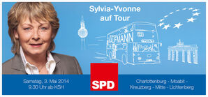 Mit dieser Wahlkampfaktion der etwas anderen Art wollen wir ein starkes und sichtbares Zeichen setzen für die SPD und für unsere Europakandidatin in Berlin, Sylvia- Yvonne Kaufmann. Wir fahren einige der belebtesten Plätze Berlins ab, mit einem alten Büssing- Doppeldeckerbus, Jahrgang 1968, der bunt geschmückt zu „Sylvia- Yvonnes Bus“ wird. Voll bepackt mit Wahlkampfmaterialien machen wir an diversen Orten Halt und kämpfen für die SPD!